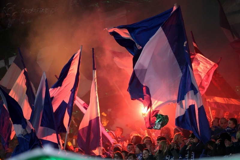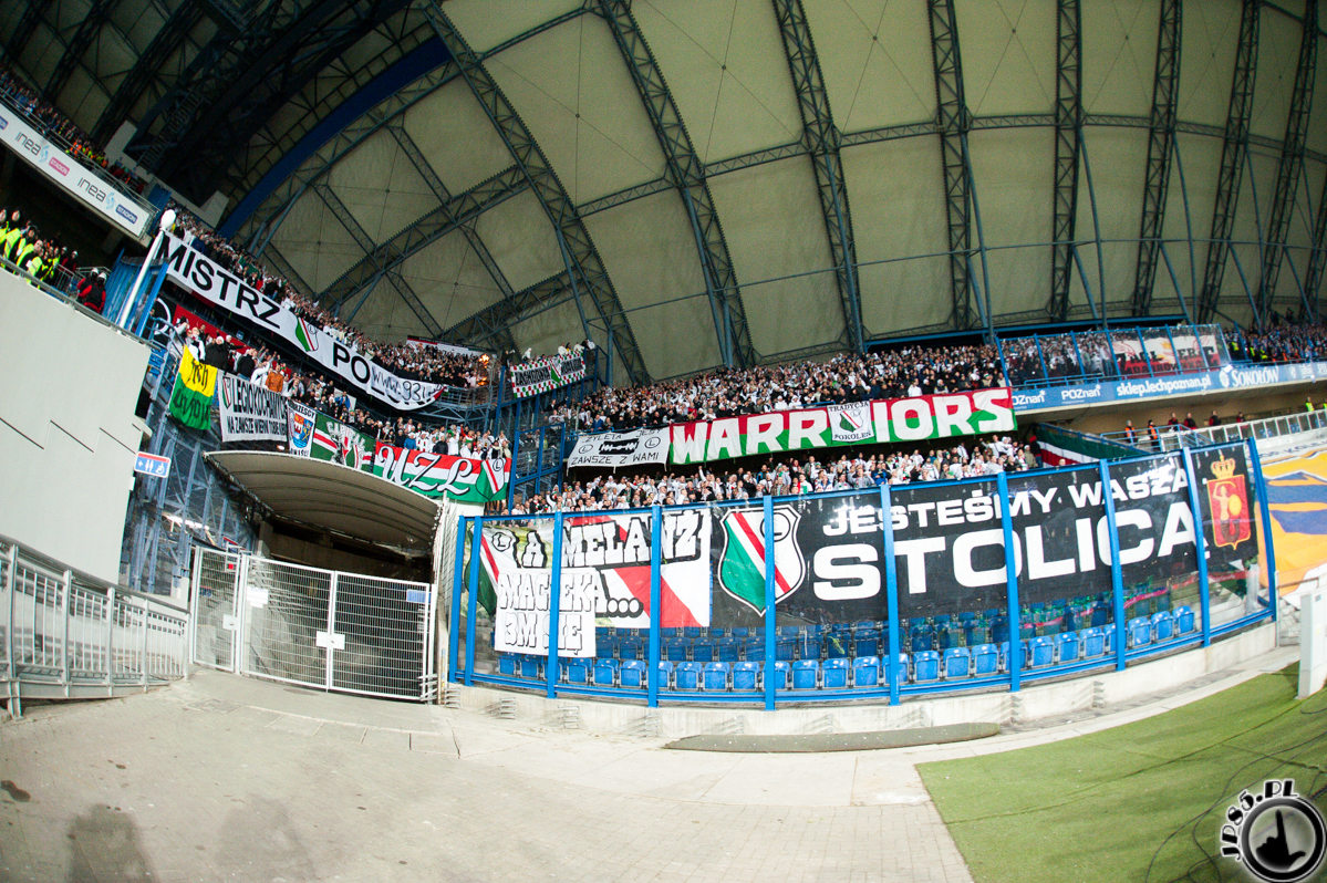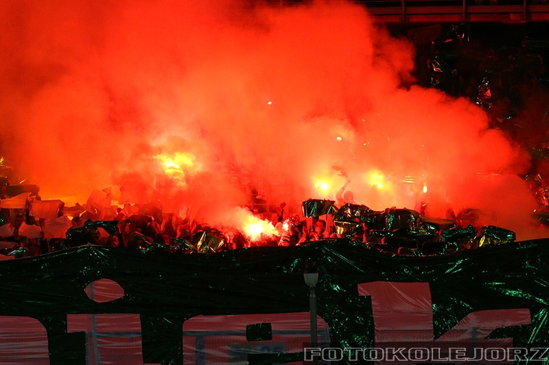 Na koniec słowo o przyjezdnych, obecnych na meczu w około 2 tysiące osób, które słychać było tylko na początku meczu. Z racji problemów wewnętrznych nie można było spodziewać się raczej z ich strony oprawy, jednak po słabiutkiej prezentacji właściwie wszystkich przyjeżdżających do nas ekip – to właśnie warszawiacy mieli cokolwiek pokazać. Dobrze oflagowali swój sektor przywożąc 22 flagi, jednak nie najlepiej było u nich z barwami. Kiedyś cały sektor Legii był w kolorze białym, w niedzielę było z tym kiepsko. Wokalnie tak jak zostało to wspomniane legioniści byli słyszalni na początku meczu, jednak później ich głos zniknął w naszym obłędnym dopingu. Między nami nie brakowało także wymiany uprzejmości, przyjezdni spalili poza tym trochę naszych barw. Podsumowując, zaprezentowali się jednak wyjątkowo bezbarwnie.