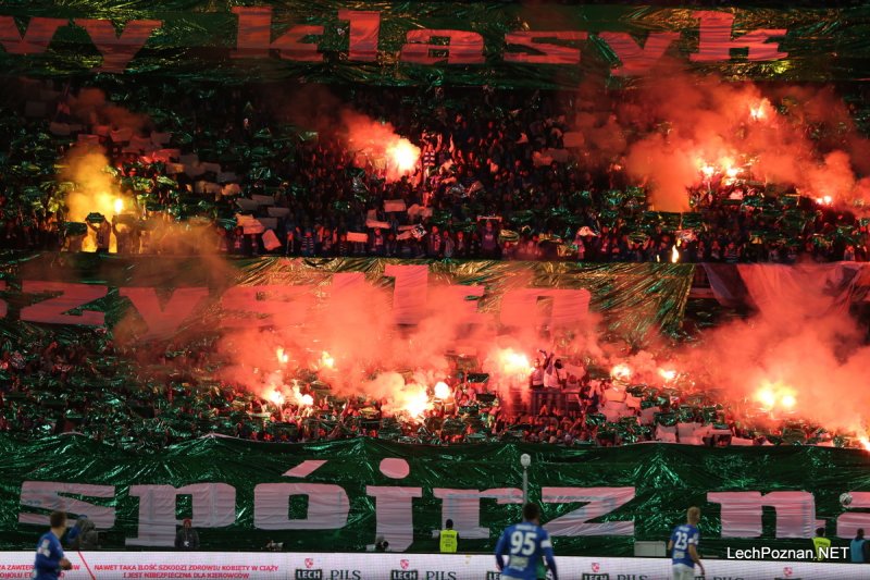 Tradycyjnie na około miesiąc przed „hitem rundy” zaczęło się szaleństwo. Nagły wysyp kibiców Lecha w całej Polsce, fani „ligowej piłki”, jednodniowi kibice, napinacze, a także wszelkiej maści stado januszy, żuli i innych wynalazków. Jednym zdaniem folwark i menażeria znana nam z meczu z warszawiakami z wiosny 2011 roku, a także pucharowych potyczek z roku 2010. Dla fanatyków i kibiców, także tych piknikowych z innych trybun ale będących na Lechu „od zawsze” jest to prawdziwa zmora i najgorsza z plag. Pomijając kwestię braku jakiegokolwiek rozgarnięcia kibicowskiego, życie na takim meczu utrudnia też ogromny tłum i ścisk. Mimo to w niedzielę fanatyczna część trybun stanęła na wysokości zadania i nadała rytm wydarzeniom na trybunach, z drugiej strony trudno by było inaczej – to my byliśmy w swoim drugim domu. To do nas należało nauczyć „nowych” naszych zasad, a także być może przyciągnąć kogoś na stałe, aby wkręcił się w nasz świat i zajarał naszym stylem.