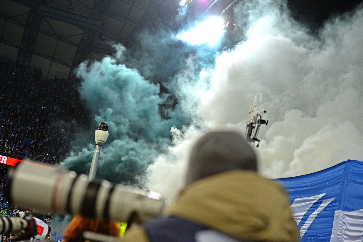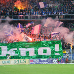 Pirotechnika płonęła w Kotle dobrych kilka minut, a gdy zgasła kontynuowaliśmy zabawę, zaś na dolnym płocie pojawiać się zaczął kolejny transparent.