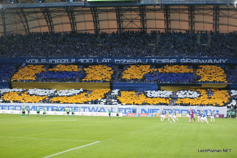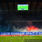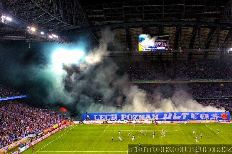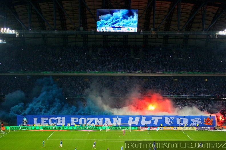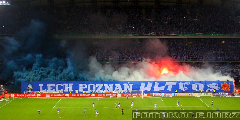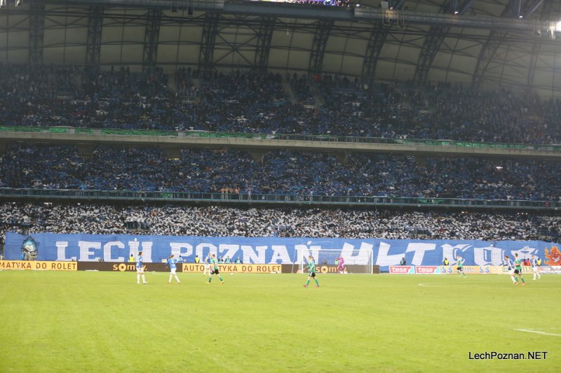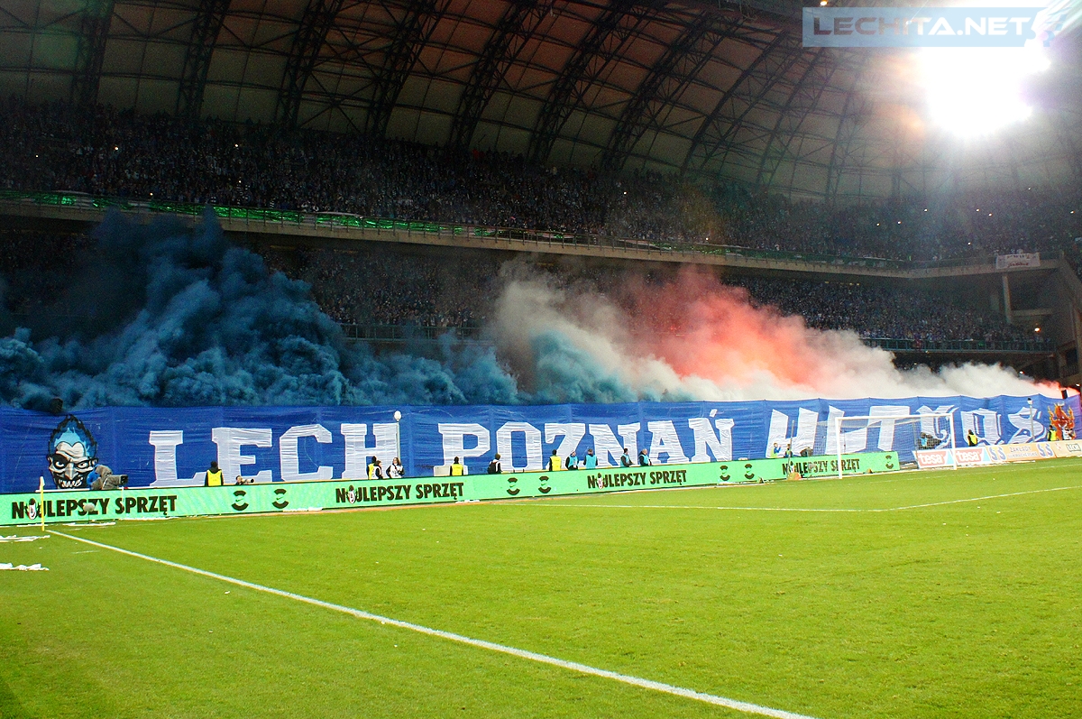 Tym razem był to swoisty podpis tych, którzy od grubo ponad dziesięciu lat upiększają nasze trybuny. Na niebieskim tle naklejone zostały białe litery tworzące napis „Lech Poznań Ultras”, z czego ostatnie słowo zostało po połowie napisane czcionkami każdej z grup ultras działających na Kolejorzu. Na przeciwległych końcach transparentu widniały także grupowe emblematy. Ten pomysł zrodził się kilka lat temu przy okazji obchodów jubileuszy powstania obydwu grup, jednak dopiero teraz doczekał się skutecznej realizacji, przy szczególnej determinacji osoby odpowiedzialnej za jedną z grup. Po odliczaniu w 80. minucie za transparentem odpalonych zostało 100 świec dymnych w niebieskim i białym kolorze. Tym razem wiatr odegrał pozytywną rolę i dym nie rozmył się, ale efektownie wznosił do góry i kierował na bok.